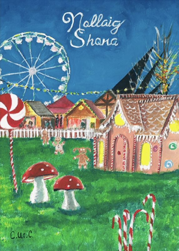 Christmas card with a painted image of the Galway Christmas market lit up at night with the words ”Nollaig Shona” written on the front. All cards are left blank on inside for your own personal message.