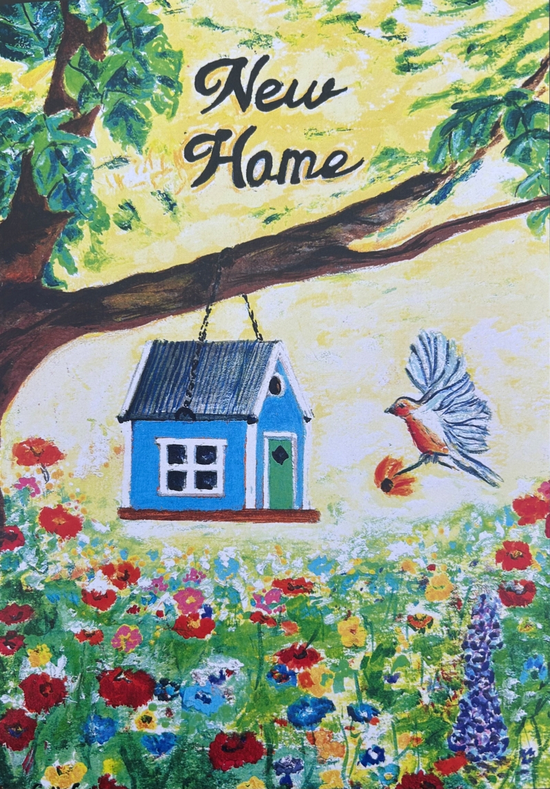 New Home | ''New home'' card with ''Teach Nua'' written on the back of card. |
