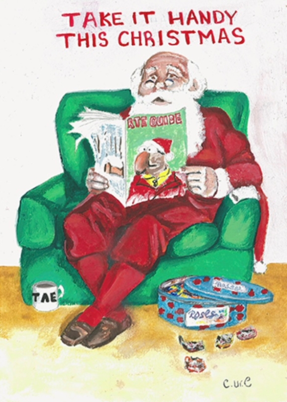 Christmas card with the image of Santa taking it handy with a mug of tae and a box of roses while reading the RTE guide. All cards are left blank on inside for your own personal message.